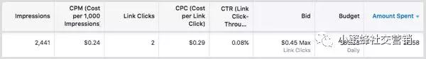 上述廣告設(shè)置的手動出價設(shè)置較高,可通過鏈接點擊進行收費。低點擊率意味著有效每千次展示費用僅為0.24美元。對于Facebook來說,這不是很多錢,所以這個廣告很快就停止了收到的印象,無論人工出價多高。